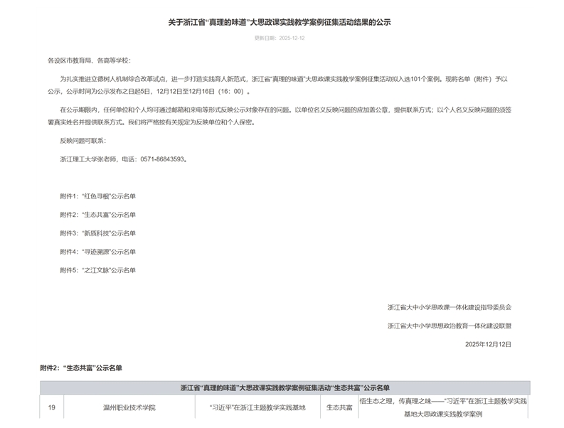 学院2个思政类教育教学案例成功入选浙江省“真理的味道”大思政课实践教学案例征集活动及思政教育教学案例...